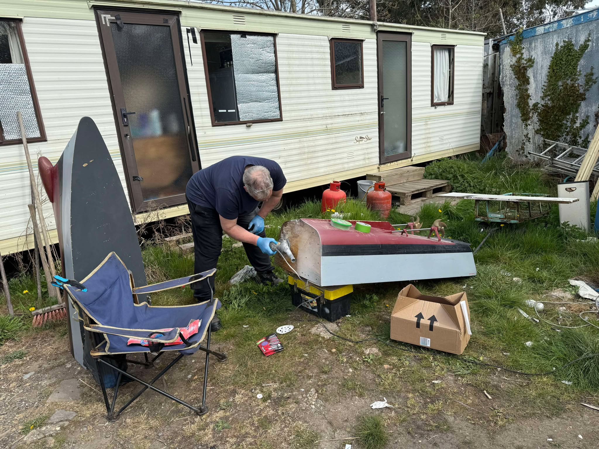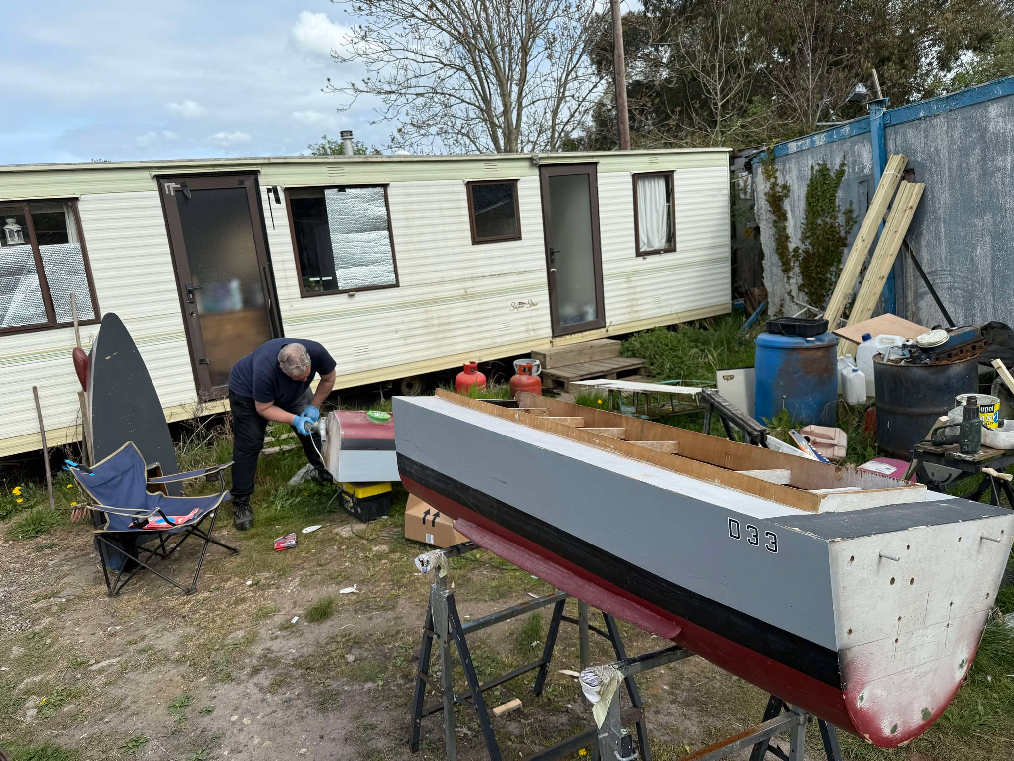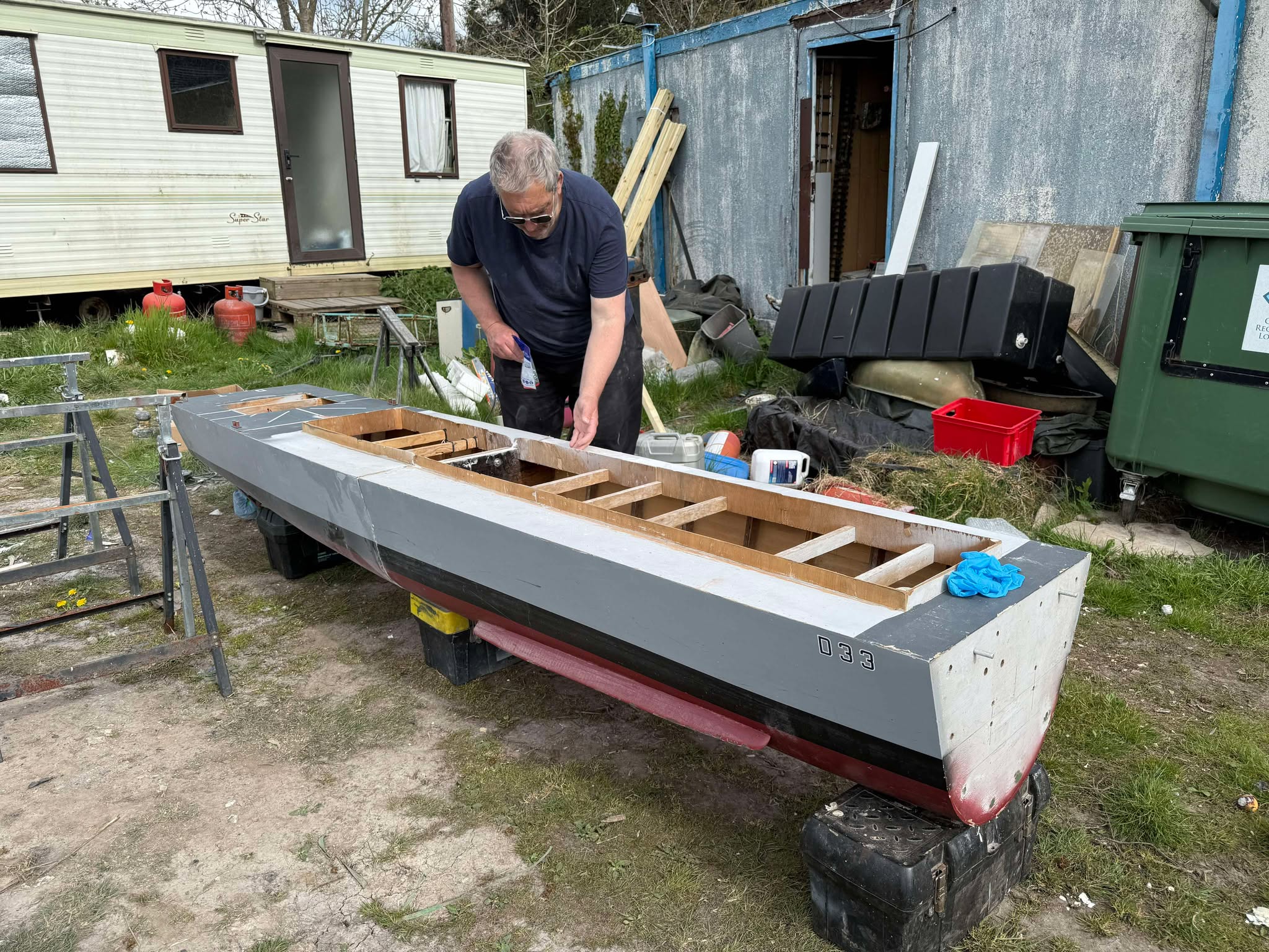 Spent the weekend of 12th/13th of april in kent with matt beck with the intention of fibreglass laminating the hull but on inspection there was some water damage that needed attention first. The section that had previously been permanently joined had very wet and deteriorating ply in the gap so we spent the time fixing this. Consequently we have now set a deadline of first show being first weekend in august at Dover Transport Museum then on to Southern model show at Headcorn at the end of august.