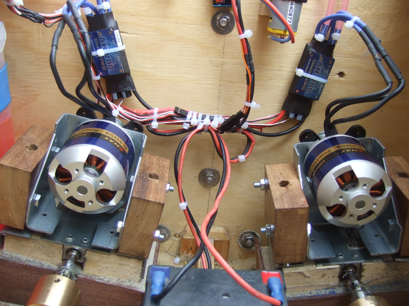 She is powered by two brushless motors geared down to drive the 6 inch phospher bronze custom made propellers