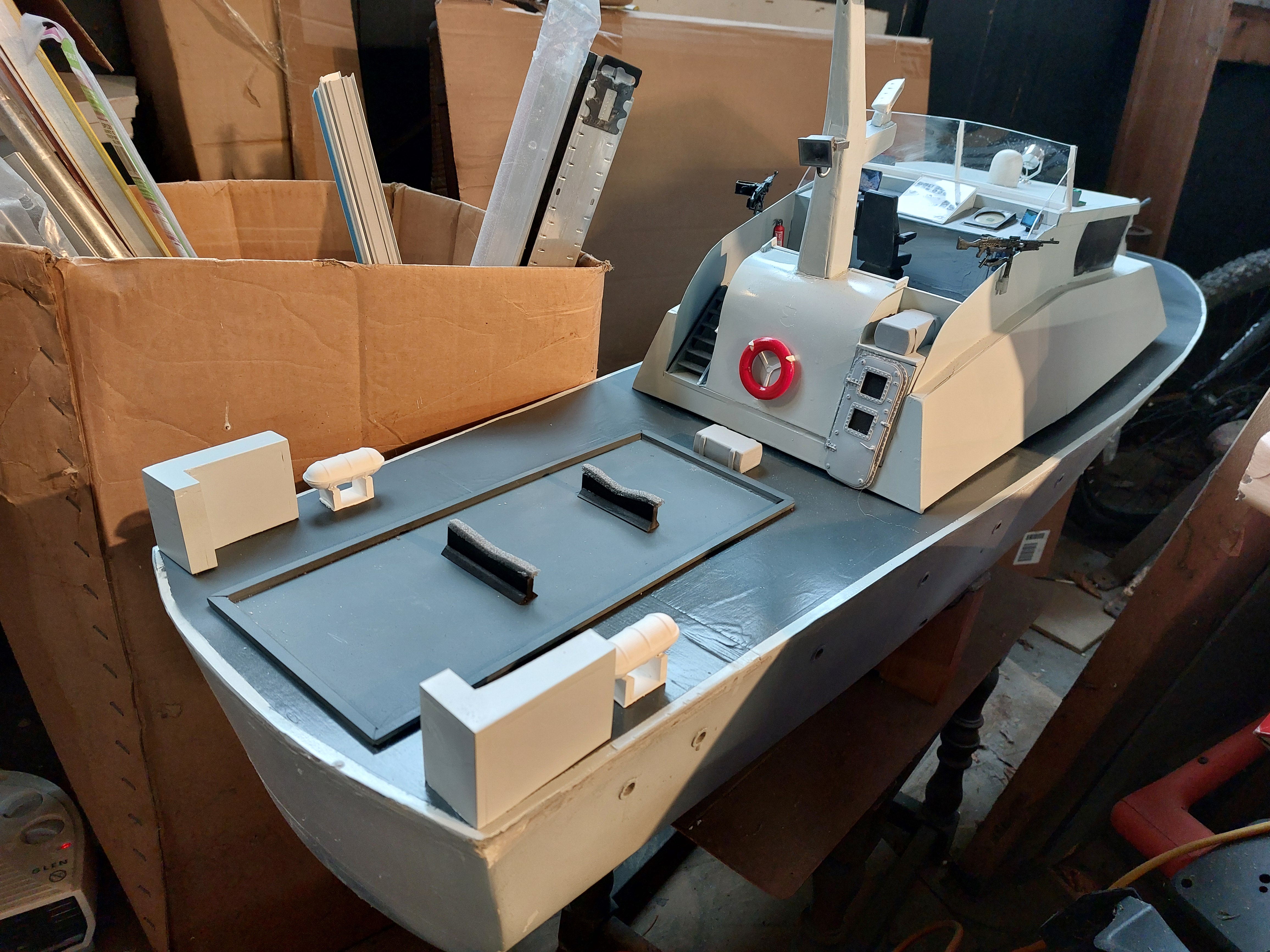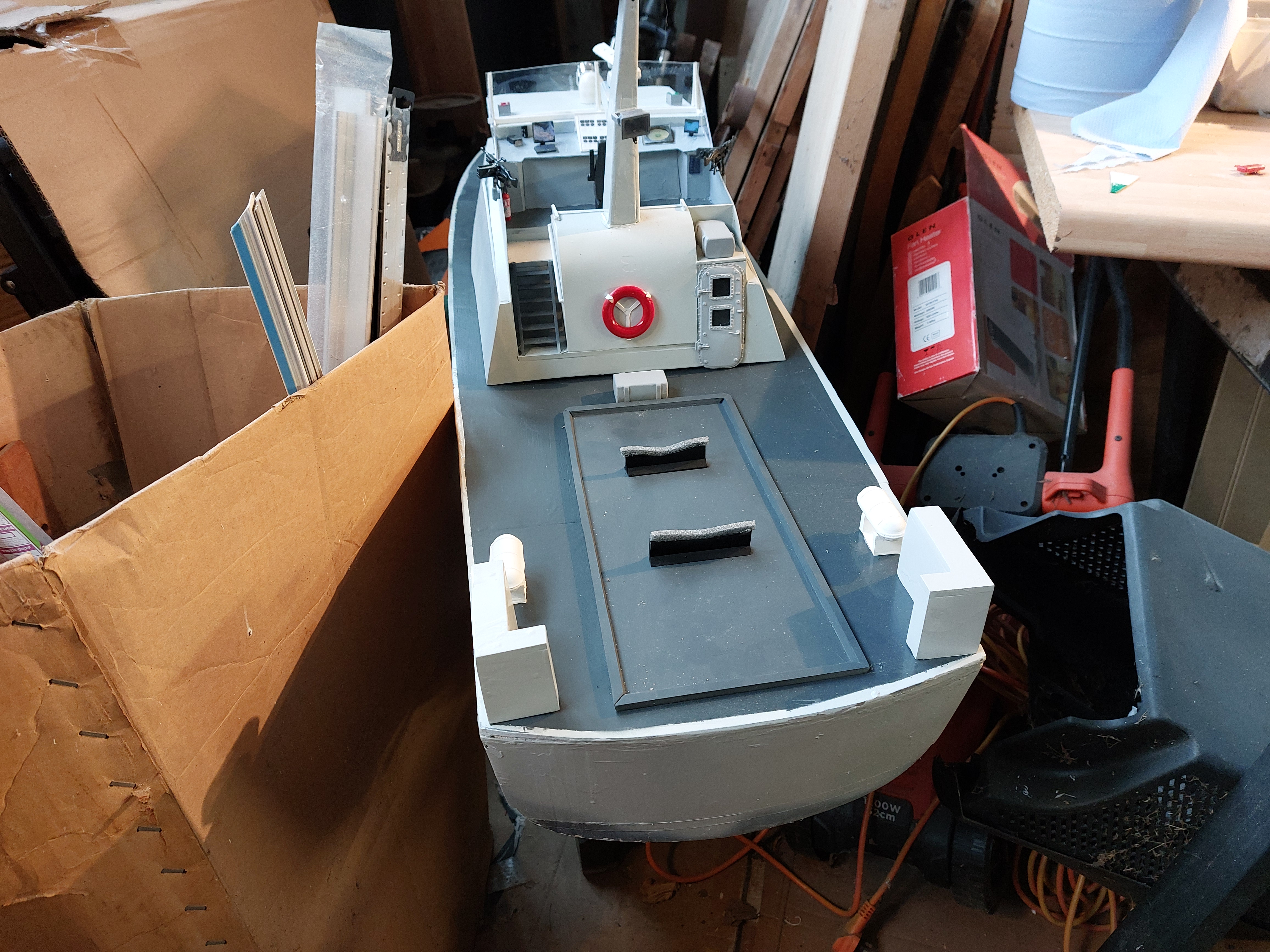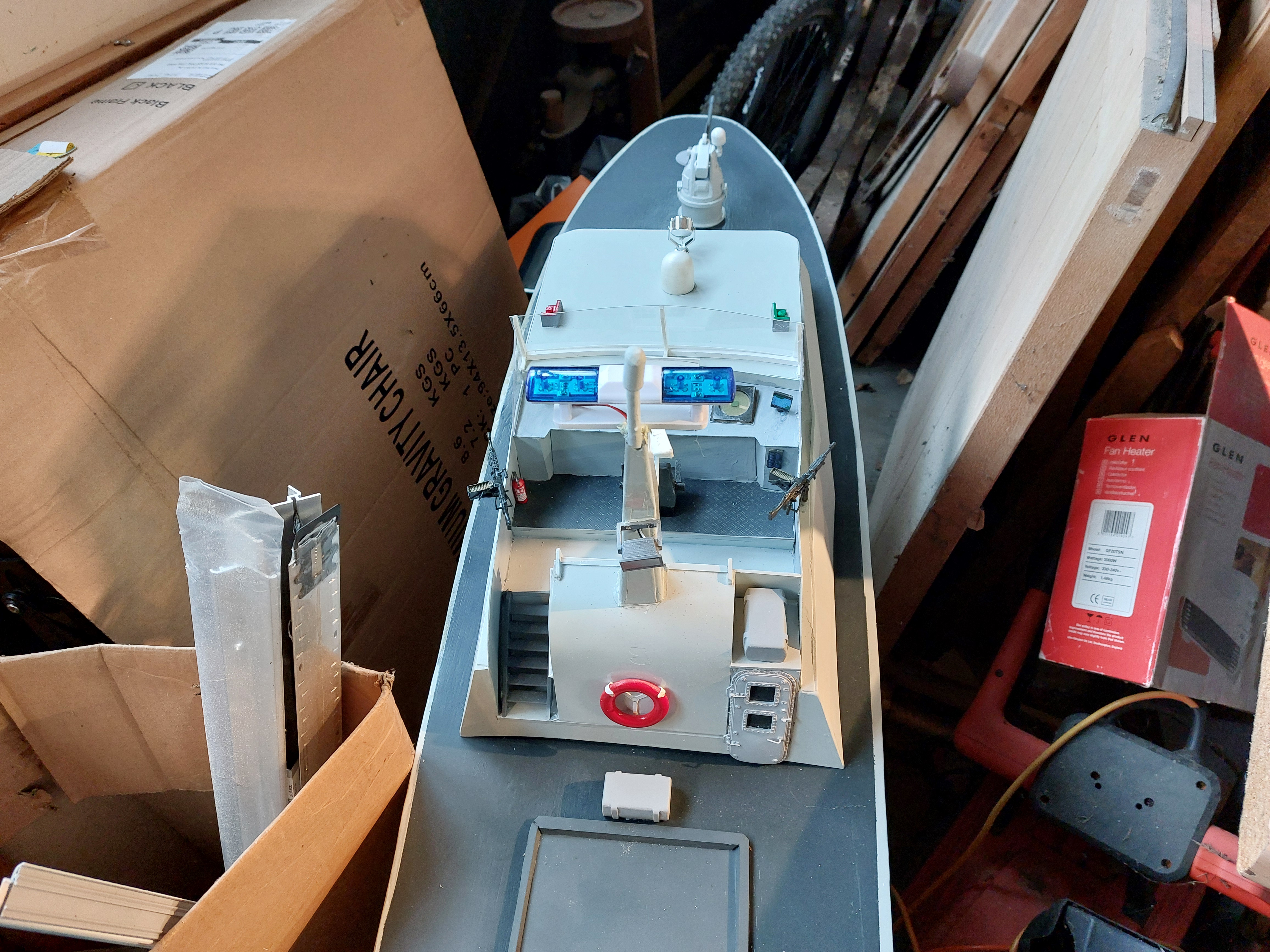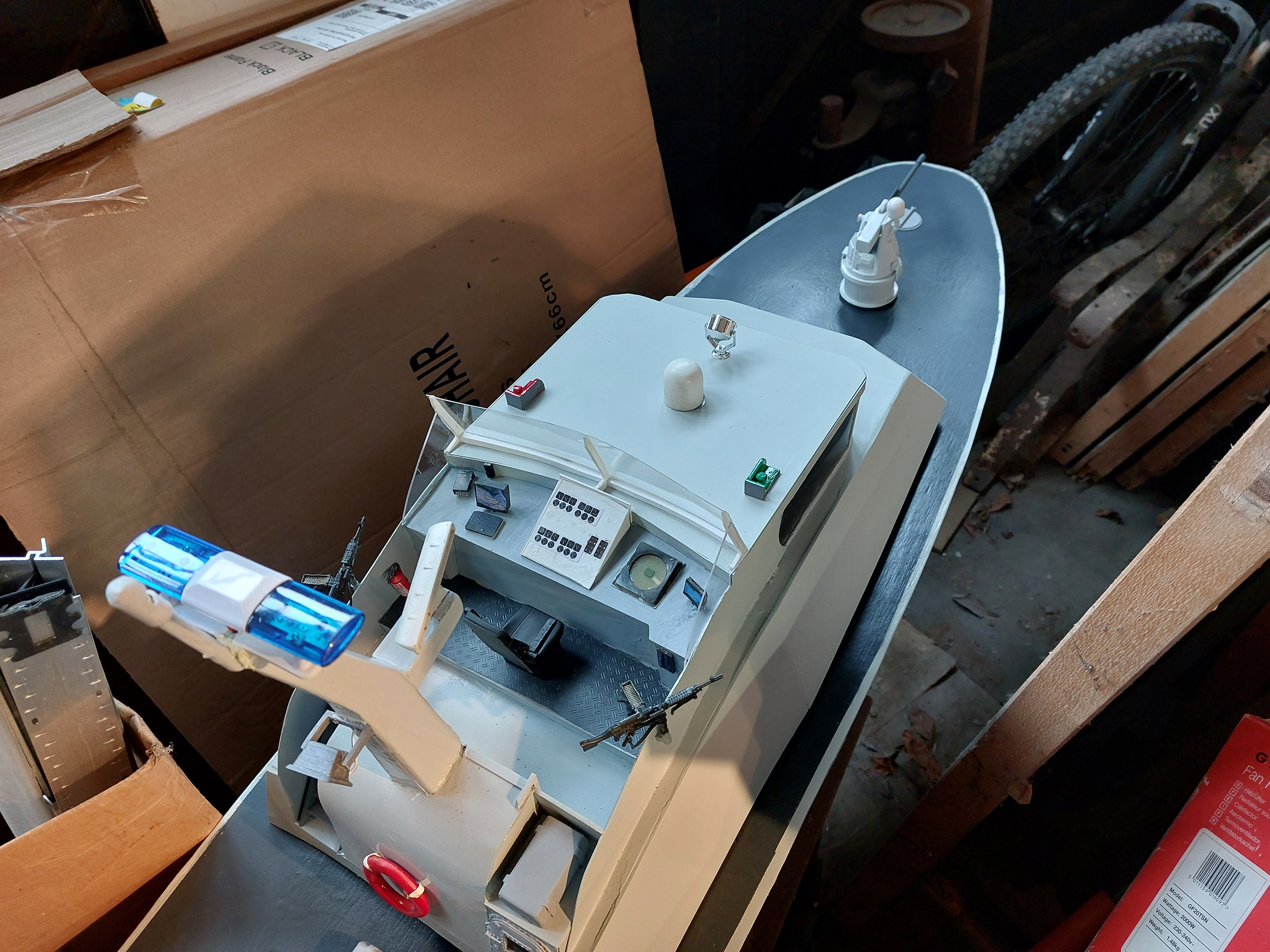 This is the full size vessel mine i am going to modify with a ramp launched patrol boat on the stern. Have now got to the stage where the bridge is almost done, deck painted and painting hull. Made the 30mm cannon on the bow and have bought two machine guns for the bridge and a minigun for the rib. You can see from the photos that the mini boat is built now having it's waterjet fitted. The superstructure is about 80 percent there with full working lights, working radar, a rear facing flood light and blue lights and a siren. I have also received a Linear Actuator for the rib rear door. Latest progress report. Superstructure now about 90% done and work progressing well on the launching ramp. A few photos of progress so far follow.