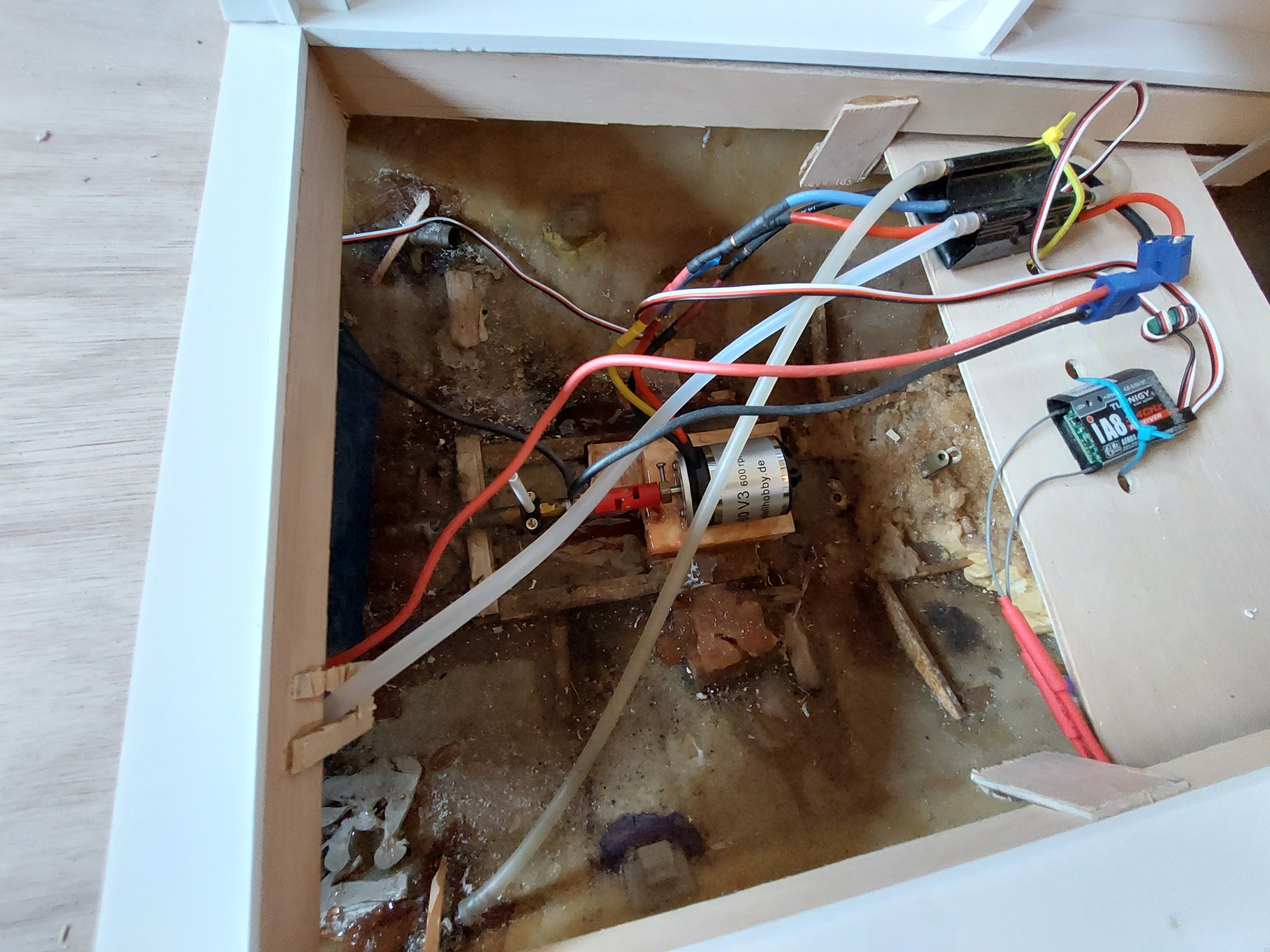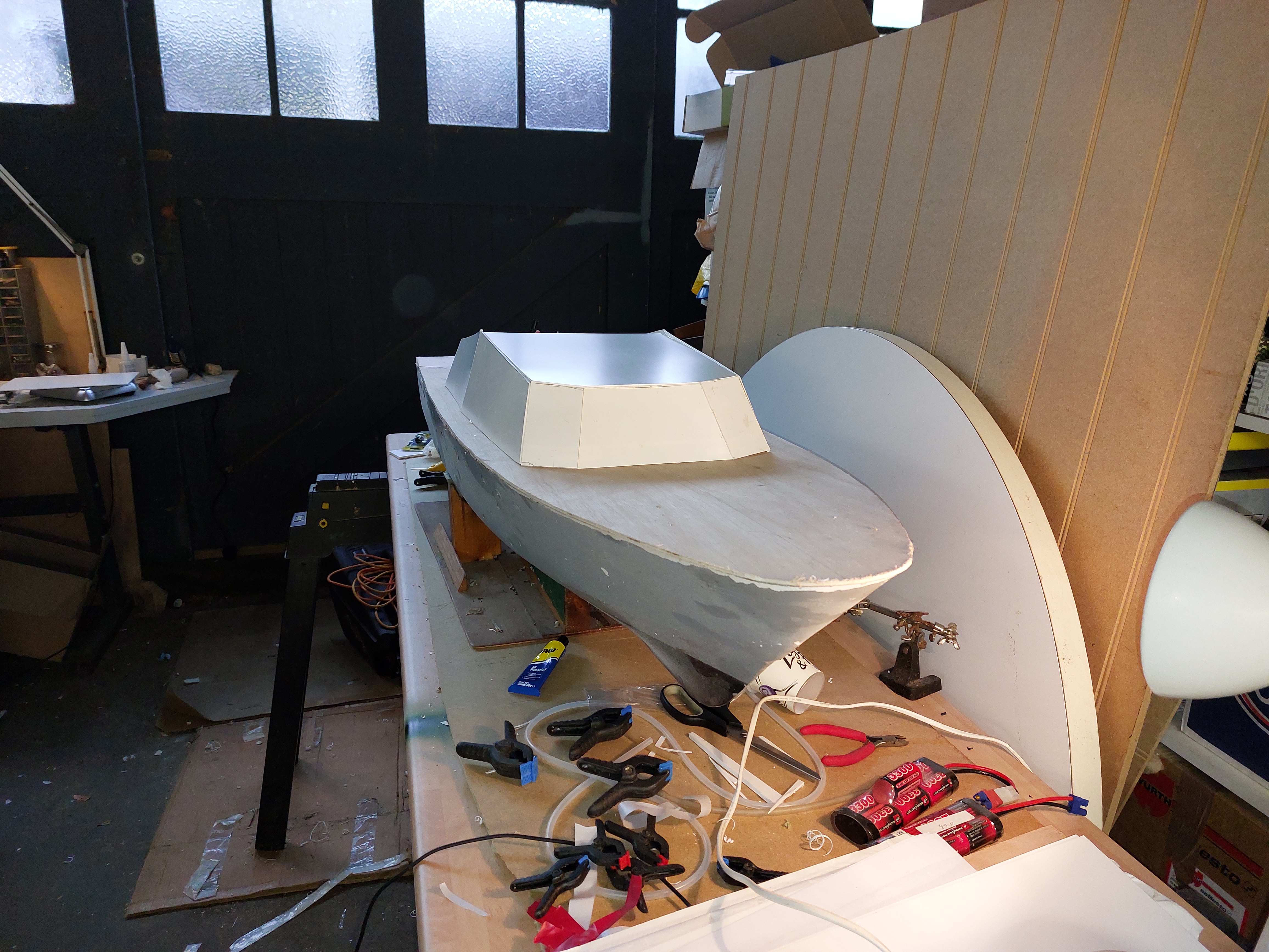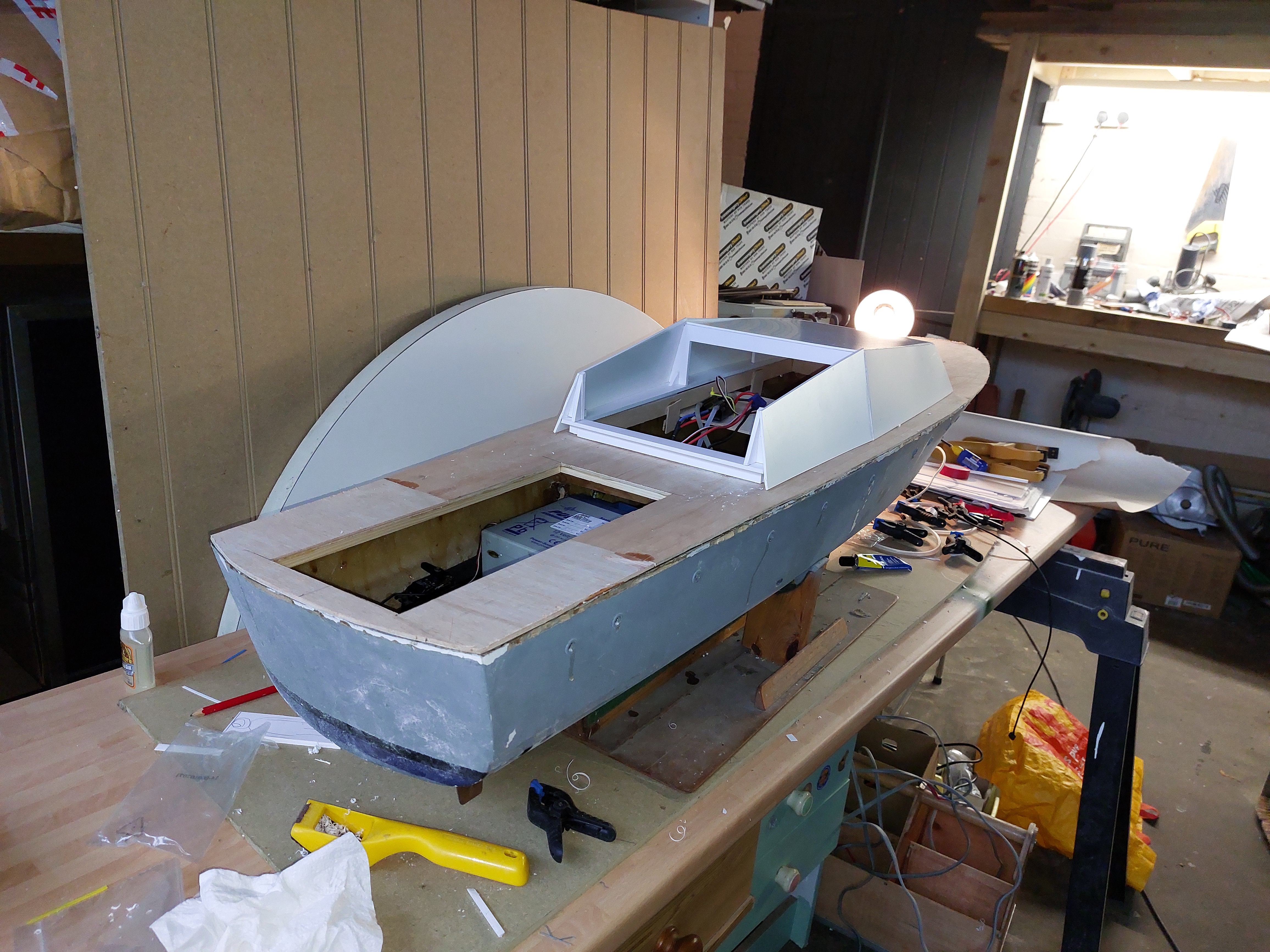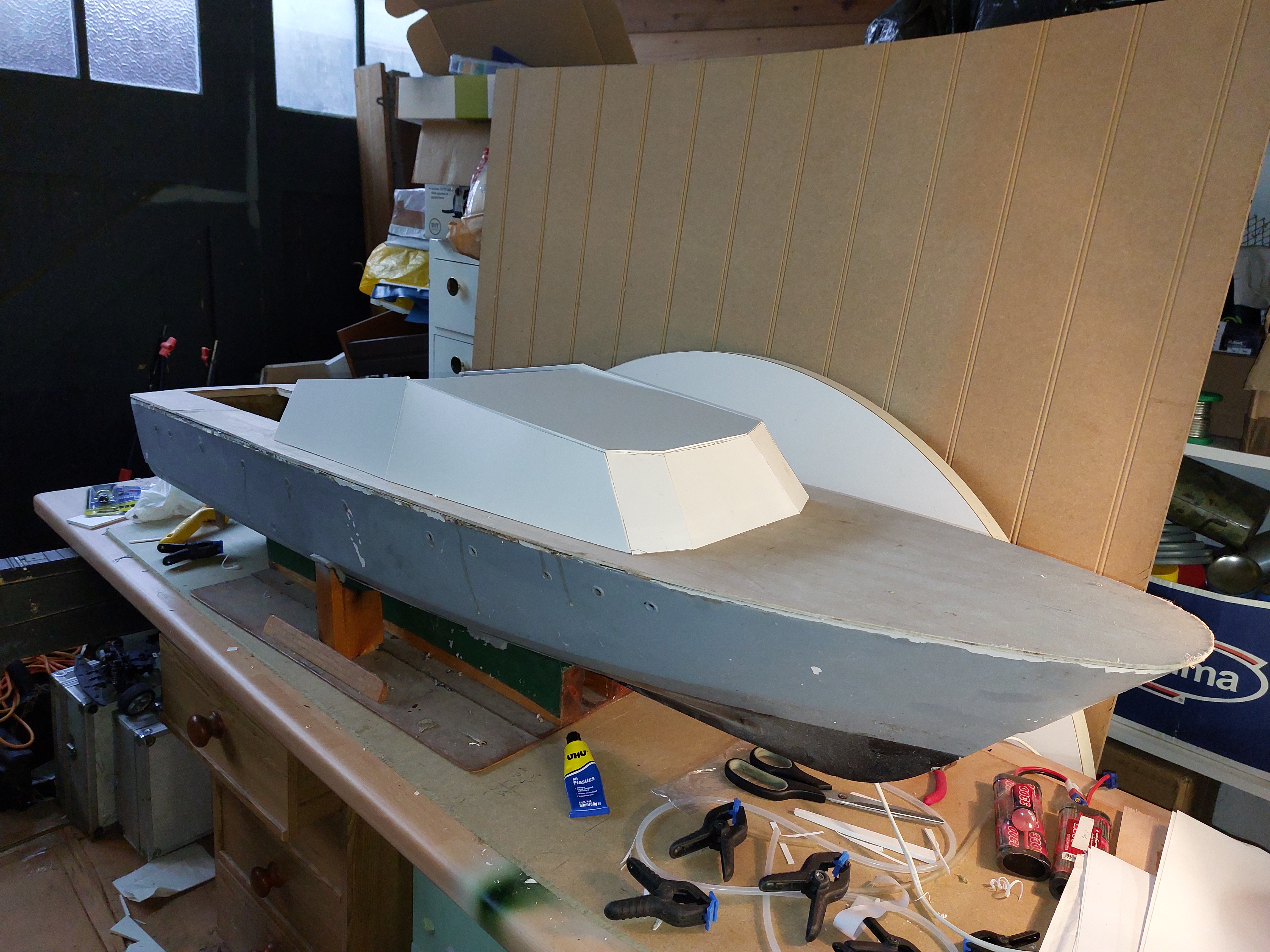 This is the full size vessel mine i am going to modify with a ramp launched patrol boat on the stern. Have now got to the stage where the bridge is almost done, deck painted and painting hull. Made the 30mm cannon on the bow and have bought two machine guns for the bridge and a minigun for the rib. You can see from the photos that the mini boat is built now having it's waterjet fitted. The superstructure is about 80 percent there with full working lights, working radar, a rear facing flood light and blue lights and a siren. I have also received a Linear Actuator for the rib rear door. Latest progress report. Superstructure now about 90% done and work progressing well on the launching ramp. A few photos of progress so far follow.