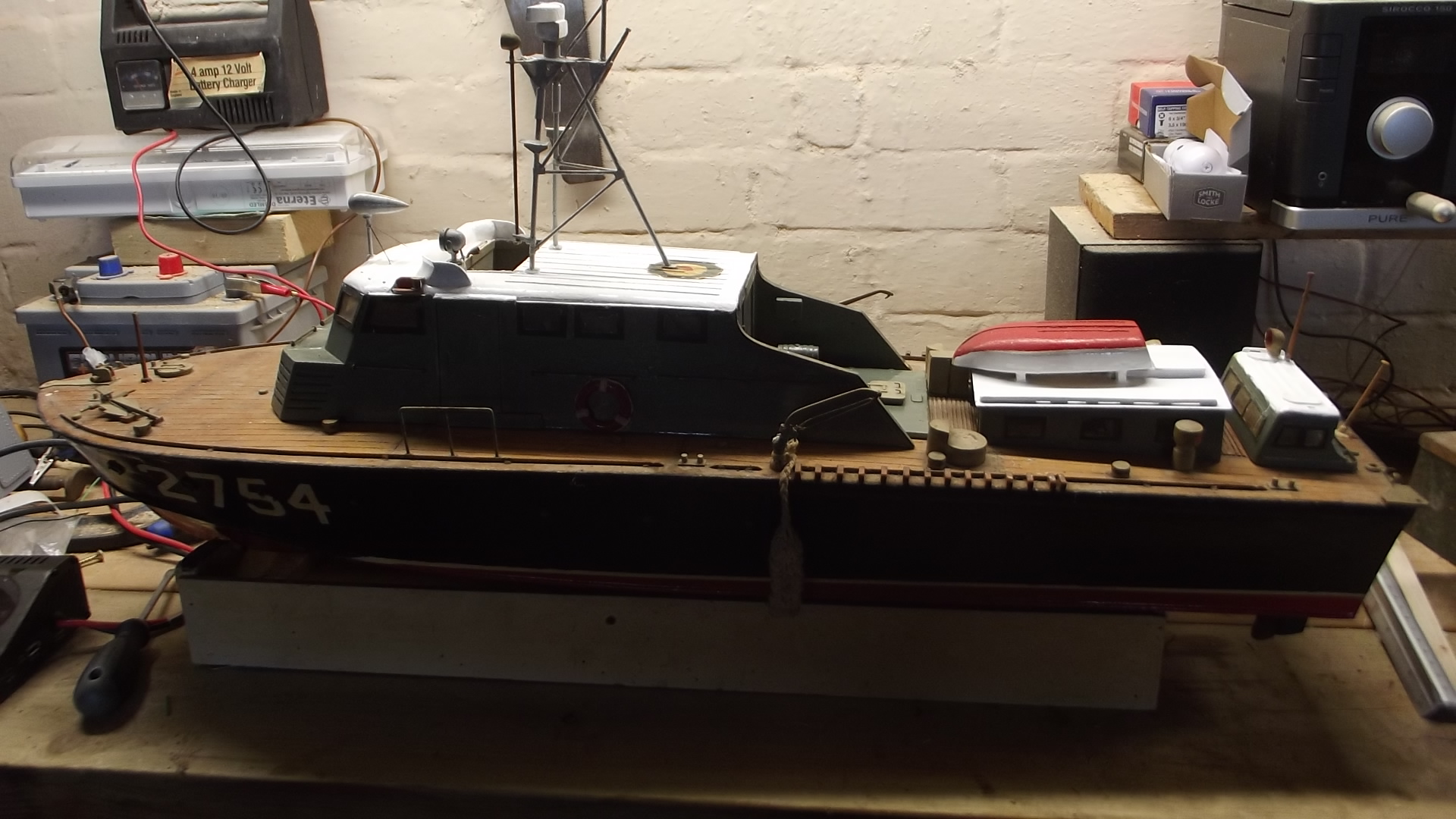 This boat is the Vosper Thornycroft RTTL range target towing launch and it must have been made in the 50's or 60's. Its a lovely piece of work all in wood and was powered with an old taycol electric motor with a set up for straight running.