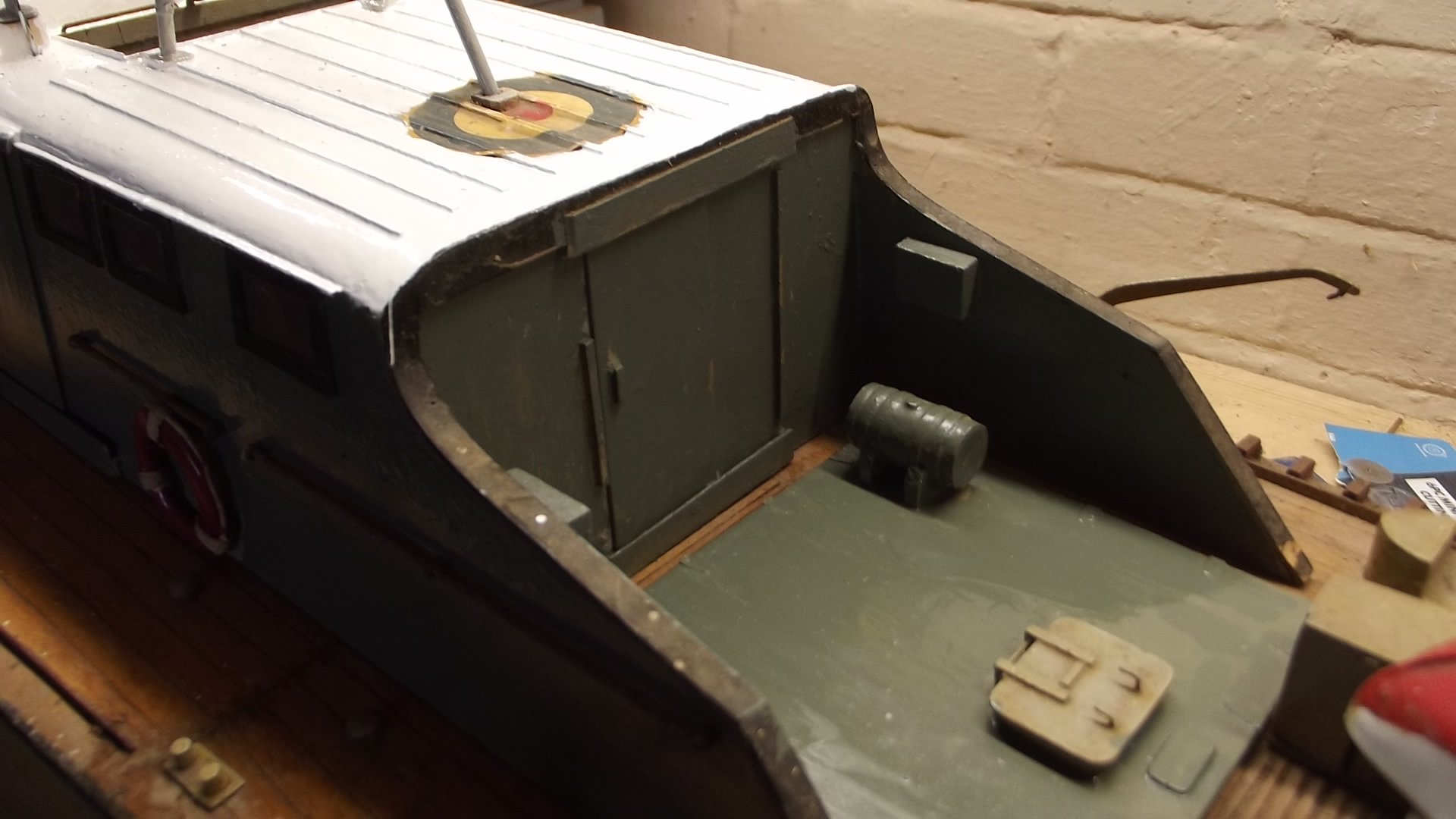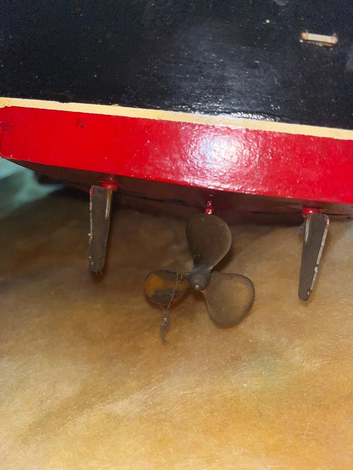 Now it's equipped with a probably too large brushless motor but i can always throttle back. Twin radio controlled rudders and had a repair and repaint session and is now looking good but still original hopefully. The pictures show before good detail on a lovely made old model that i have done my best to keep as original as possible.
